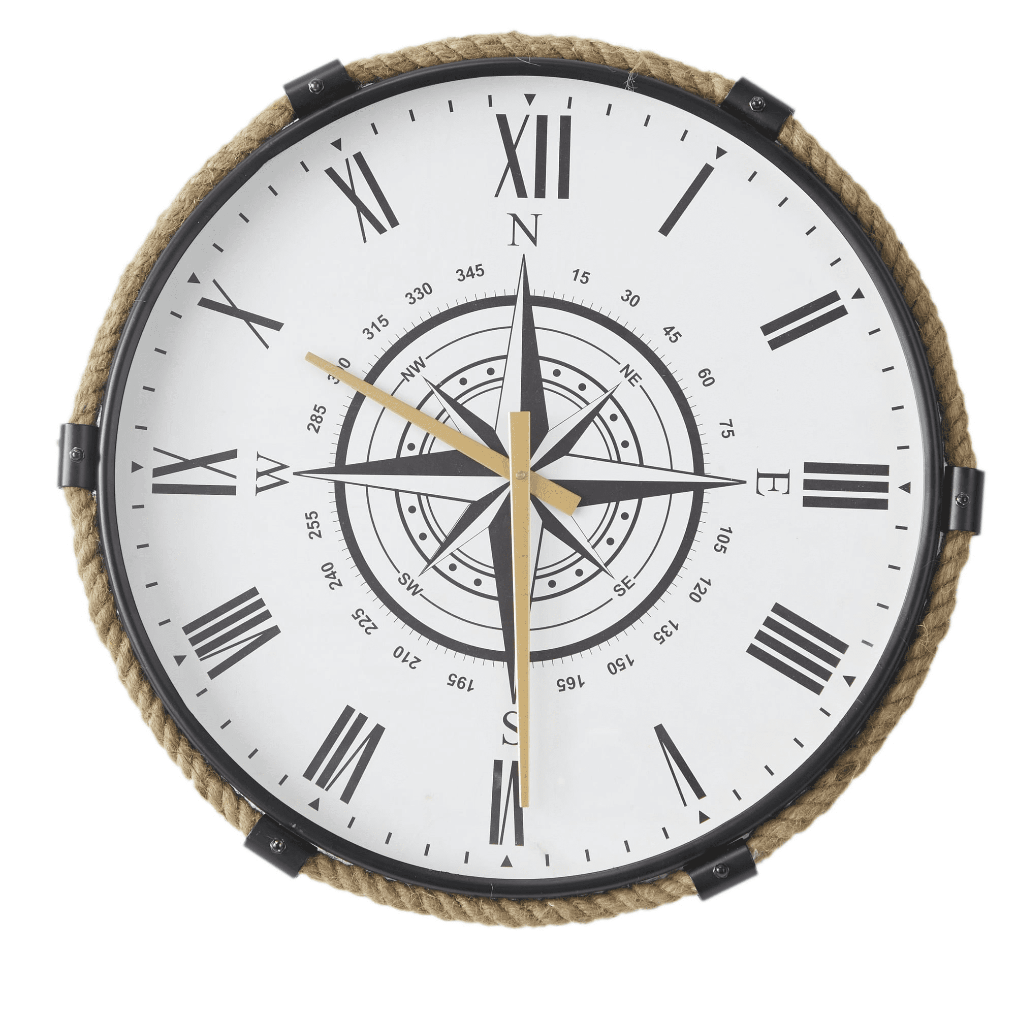 Decmode 20" brown stainless steel compass wall clock with rope accents is a unique addition to your stylish home. Bring functionality and style into your home with statement wall clock to maximize any open wall space. Take control of your day and keep track of time with this classic designed wall clock with a modern flare. Like a functional art piece for your wall, this round wall clock adds a finishing touch to any room in your nautical themed home with its compass inspired design. Requires 1 aa battery. Battery not included. This item ships in 1 carton. The clock face of this wall clock flaunts a white and black surface with arabic numerals, gold slender clock hands, and a large compass print in the middle. The clock mechanism runs silent. Stainless steel wall clock makes a great gift for any occasion. Can be hung vertically using the keyholes; nails and screws not included. Suitable for indoor use only. This item ships fully assembled in one piece. Made in india. This is a single brown colored kitchen clock. Nautical style.