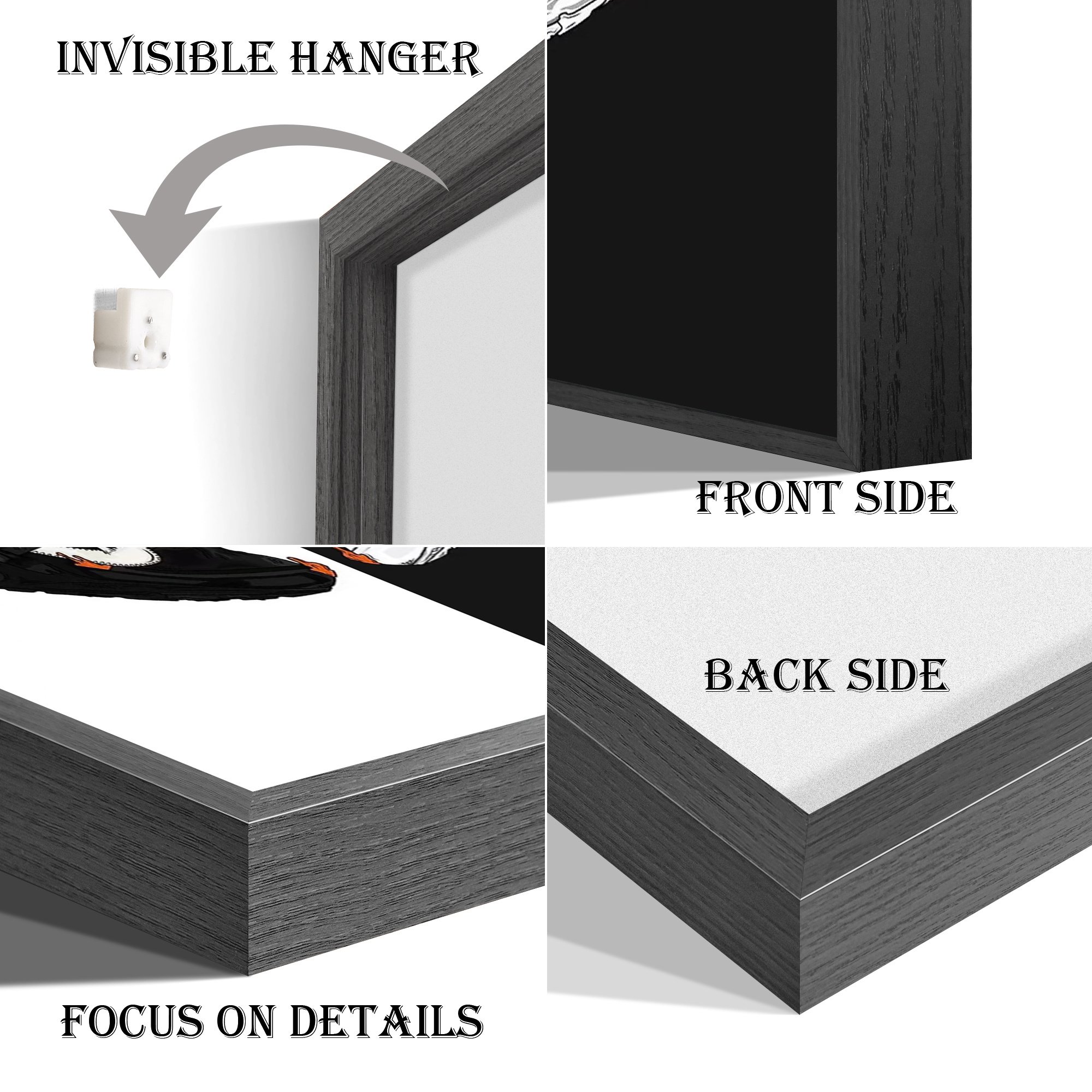 [Picture Frame]Solid wood frame;Wood texture;Not easily deformed;Impermeable dust and corrosion resistance.Hidden metal anti slip hook;We also provide you with unmarked wall studs.Can be installed quickly.