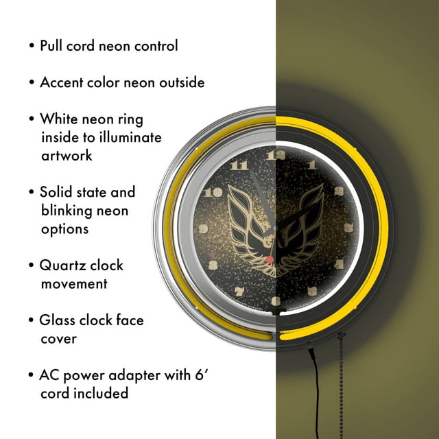This officially licensed neon wall clock is the perfect addition to any game room, garage or man cave. This impressive clock has two neon rings; one is an accent colored neon ring on the exterior and the other is a brilliant white neon ring on the interior of the clock to light up your favorite logo. Other highlights include chrome finished resin housing and a high-grade glass clock face cover. The battery-operated quartz clock mechanism will keep it ticking for a long time, while the neon runs off the included ac adapter. The neon is controlled by the pull chain and the back of the clock includes a wall hanging mount and has two modes ? Solid state and blinking. The 3? Depth of this clock combined with the radiant shimmer of the neon reflecting off the chrome housing is sure to make this clock pop on any wall!