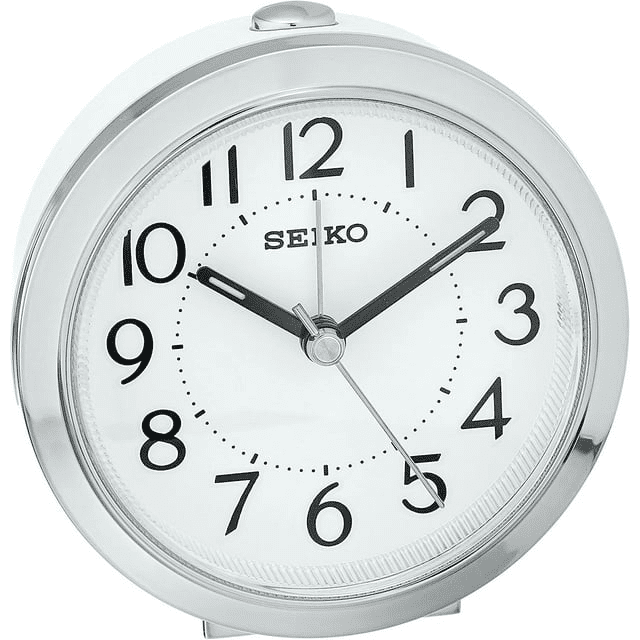 Rise and shine with our seiko illuminated round bedside alarm clock. This modern classic features a plastic case and metallic trim in your choice of finishes and includes a quiet sweep second hand, beep alarm with snooze, dial light, and luminous hands. Requires one aa battery, included.