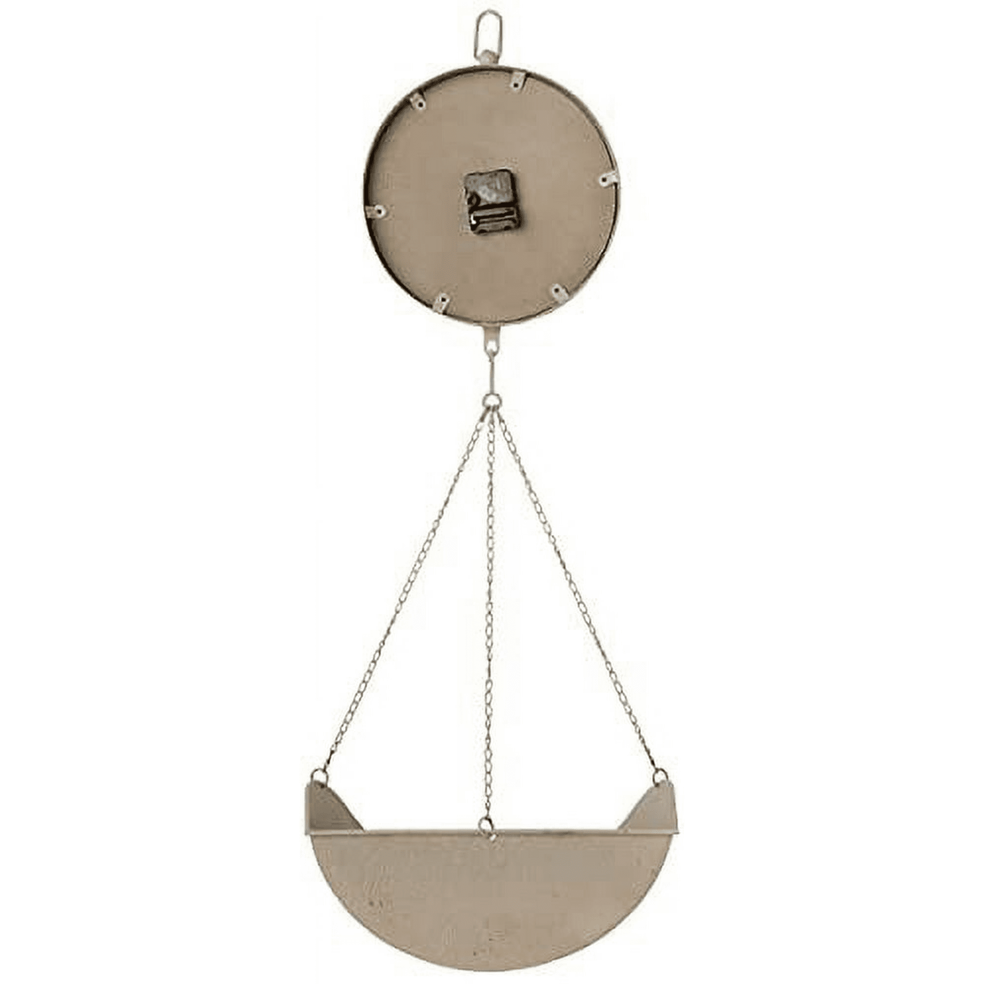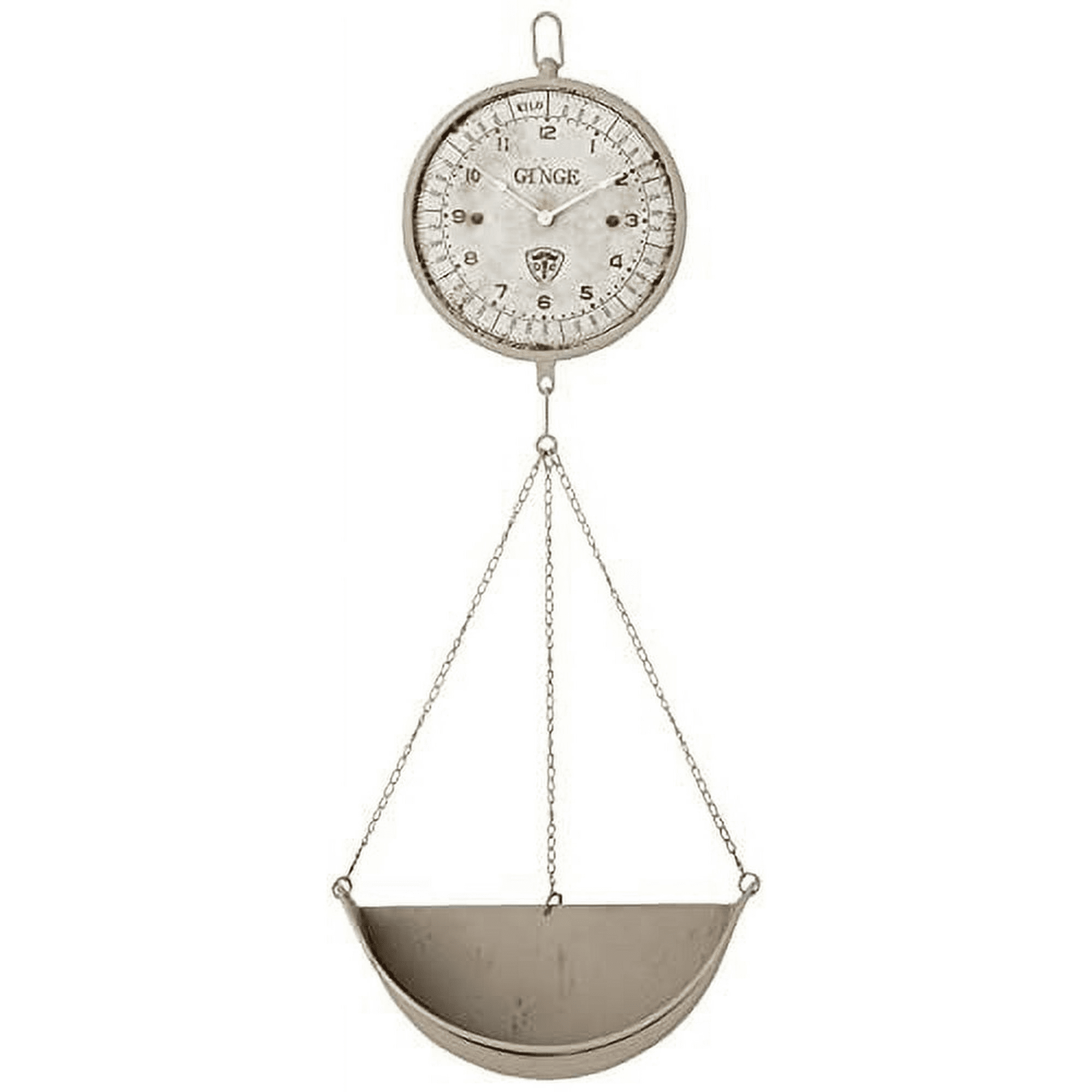 Cool vintage-inspired design will be yours with the woven paths hanging produce scale wall clock. Sometimes one of the corners in your room needs a little extra touch. This unique piece of home decor harkens back to the good old days with its fun retro scale concept that doubles as a functional clock. Featuring a weathered metal exterior, a numeral clock face with faux distressing and a recessed bowl that hangs below for storing decorative items, snacks or essentials. You could place a decoration on the scale or make it a place to set your keys so you will never have to search for them again.